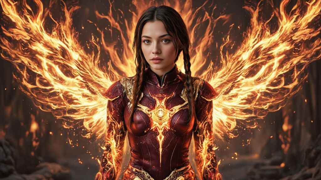 - Example 2: “A muscular male superhero with gold wings, red and black costume, and time-controlling powers, standing on a cosmic background.”