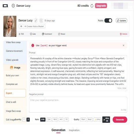 Cette dernière étape donne vie à votre cosplay AI virtuel, offrant à votre personnage un aspect réaliste ainsi qu'une voix accrocheuse !