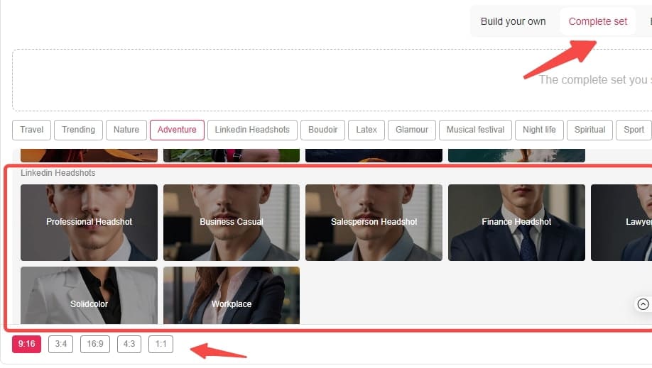 Étape 3 : Après avoir généré votre modèle IA, vous pouvez générer vos photos de CV. Trouvez « Ensemble complet », et choisissez le style qui vous convient et la taille que vous voulez. Cliquez sur « Générer » et vous obtiendrez votre photo gratuitement. Sélectionnez une photo qui vous plaît et téléchargez-la gratuitement.